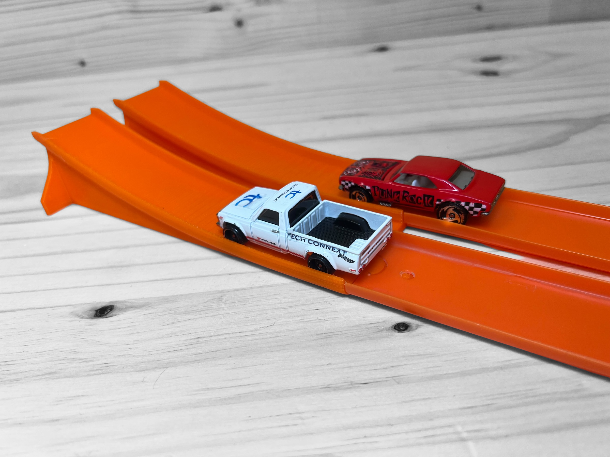 If you liked our Hot Wheels compatible Car Ramp, you’re gonna love this new Double Jump Car Ramp! My son gets so excited every time he watches his cars launch into the air, and this new product addition is perfect for doubling that fun. Watch the action as Hot Wheels, Matchbox, or 1/64 scale cars speed down the track and soar off the double ramp! How high, fast, and far can your cars go? Which car will grab the most “air,” and which car will travel the furthest? This Double Jump Car Ramp is the perfect addition to extend your Hot Wheels race track for added stunts and jumps. With 10 mm spacing between the tracks, this add-on works perfectly with Hot Wheels Track.