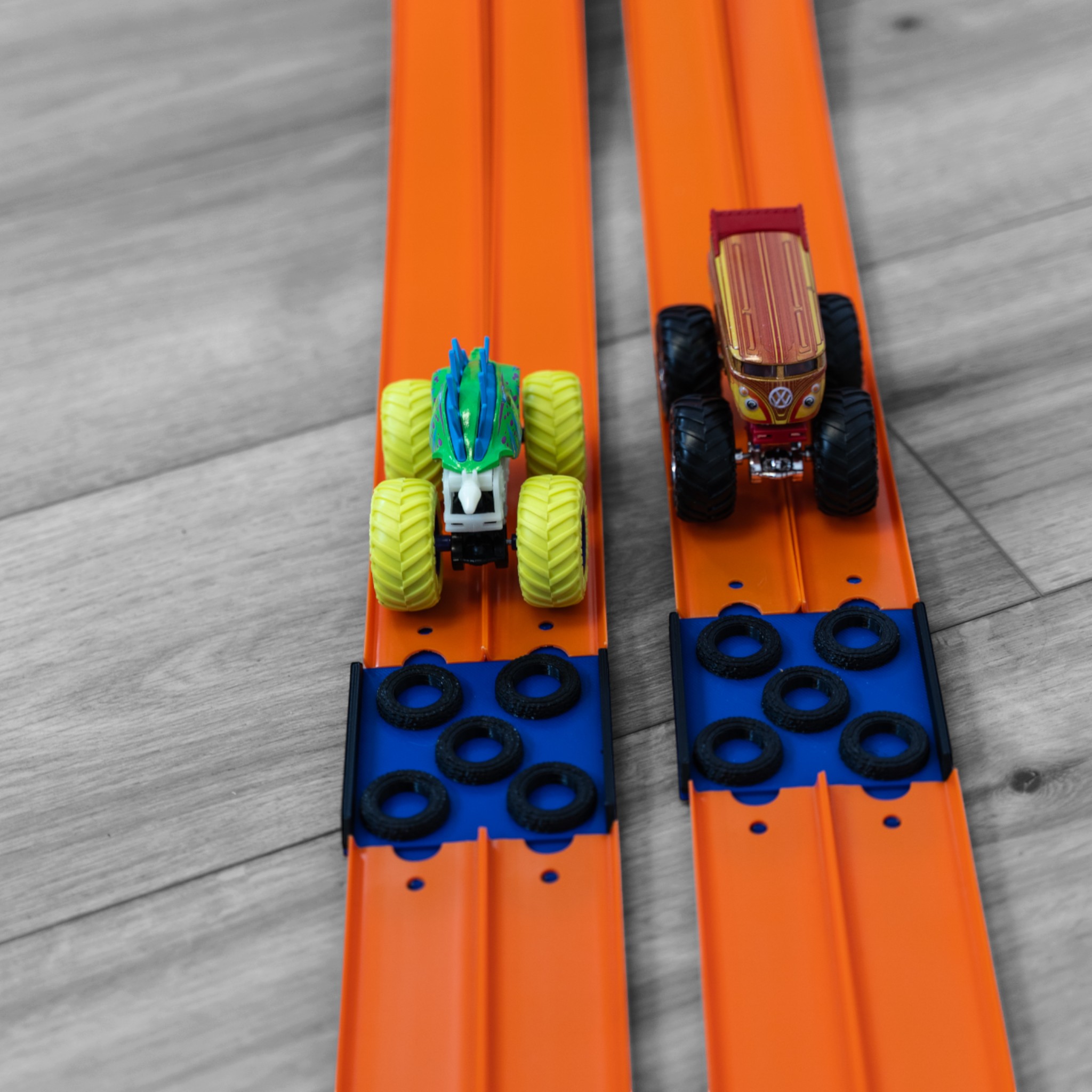 Bring big rig thrills to your Monster Truck Track with the Monster Truck Tire Crush! Designed specifically for Monster Truck stunts and racing, this exciting obstacle course add-on lets your trucks race or crawl over tires in each lane to reach the other side.