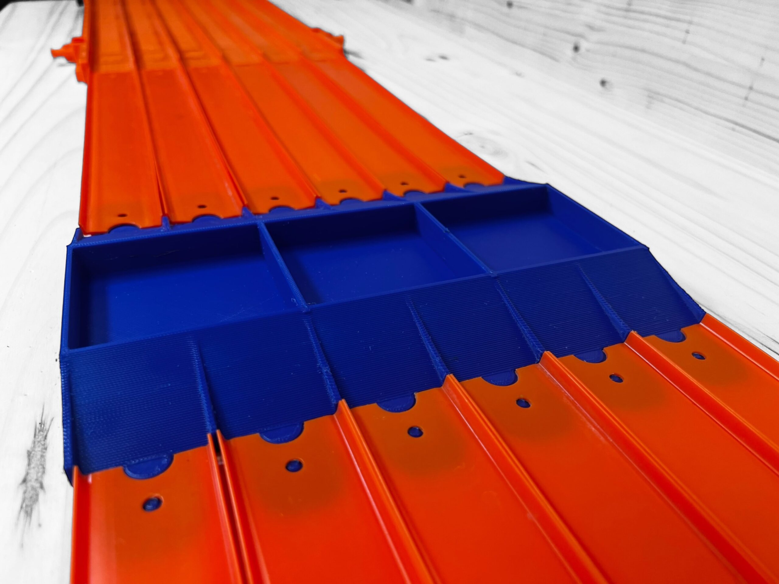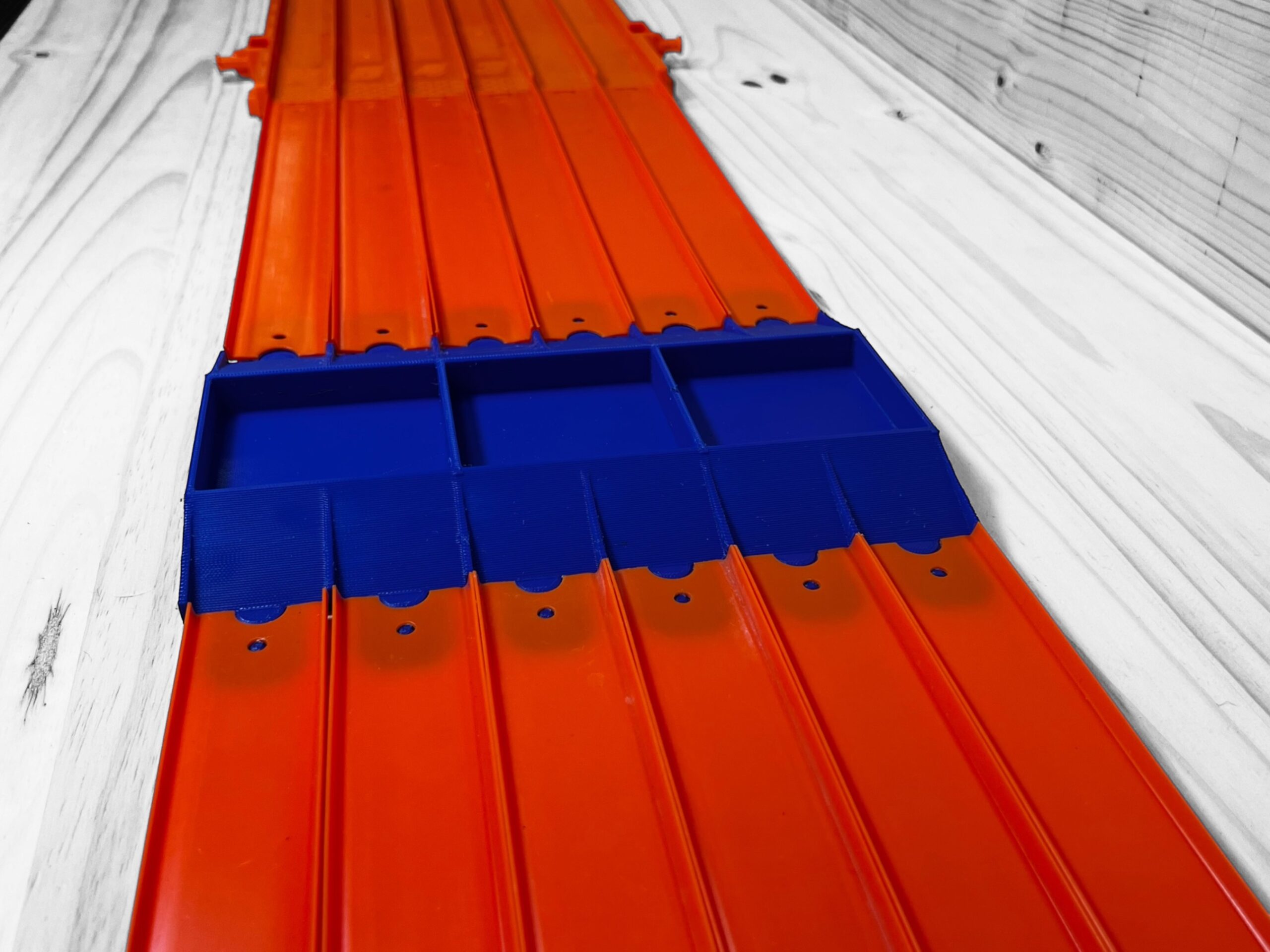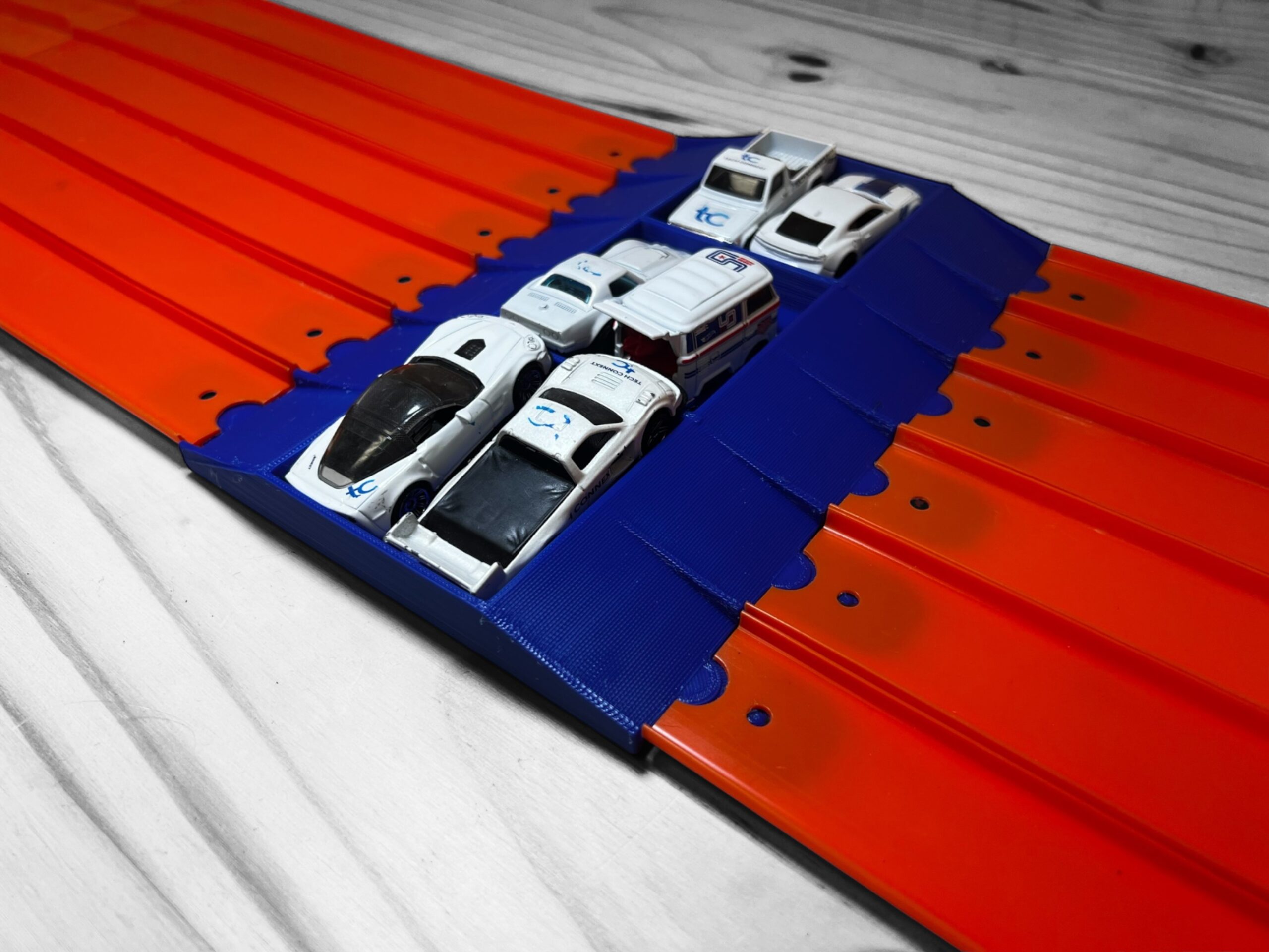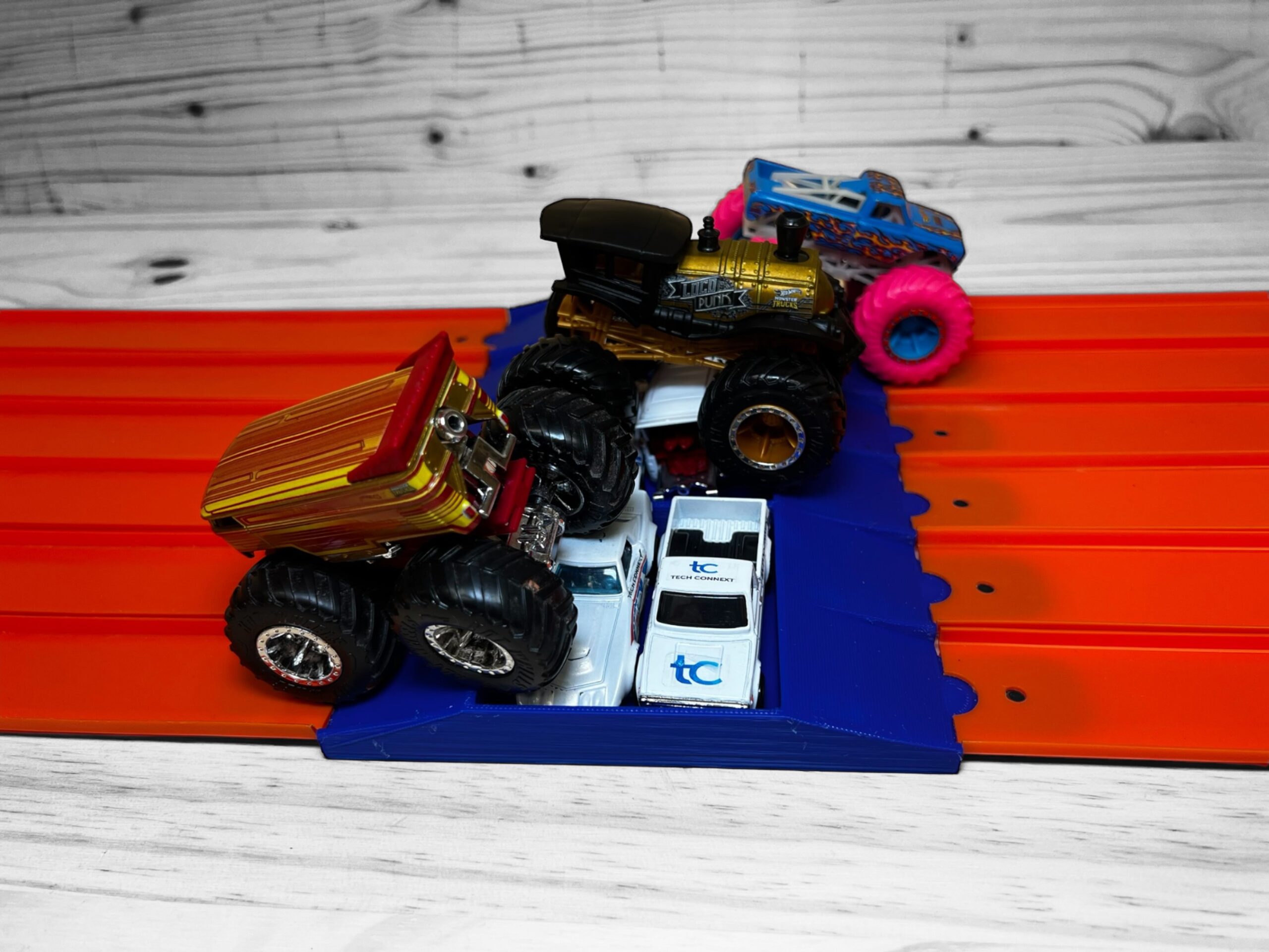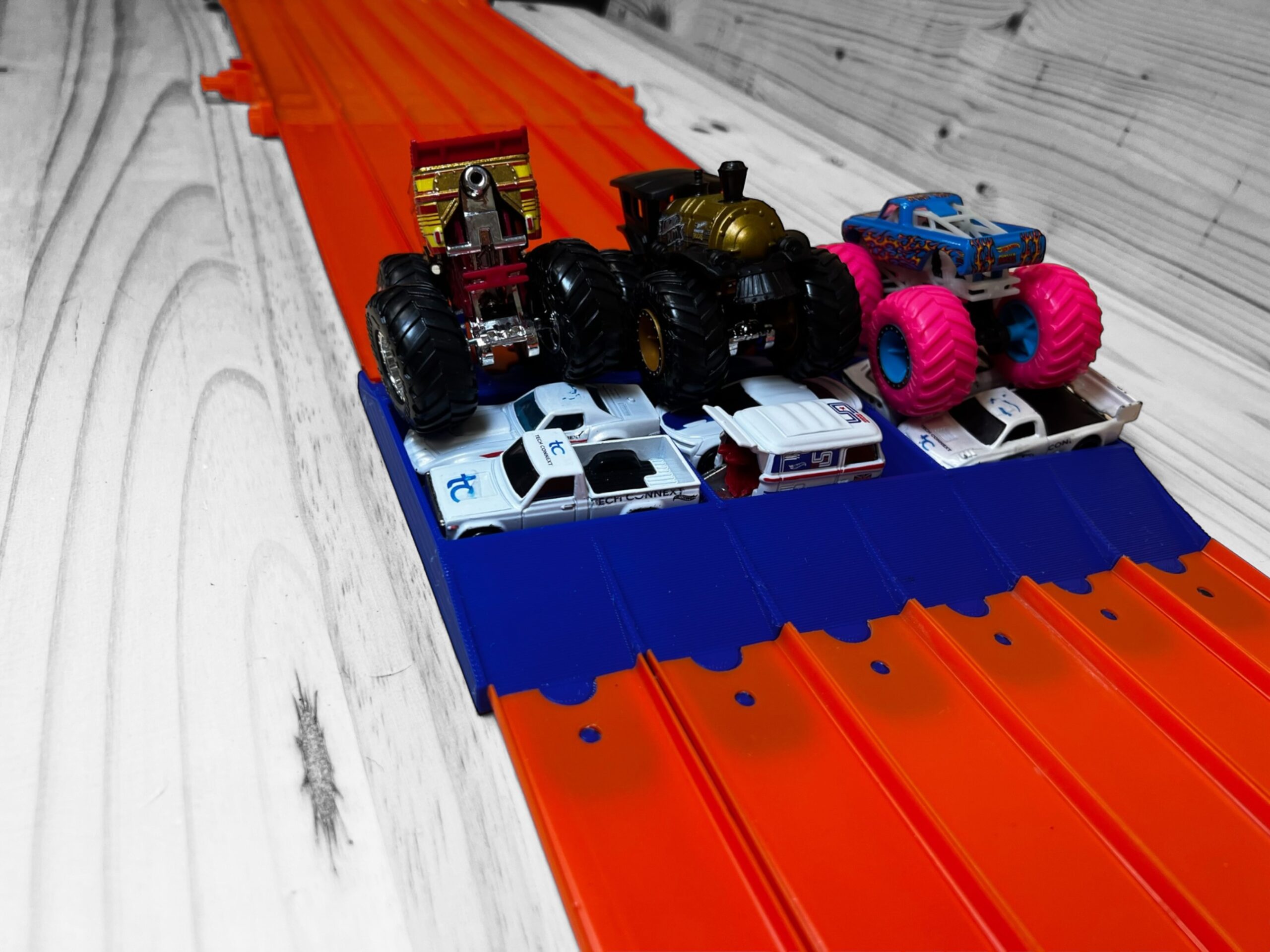 Compatible with Hot Wheels track, this add-on incorporates a small jump leading up to the car crush. Made for 1/64 scale Monster Truck action, attach the “Crush” to your Hot Wheels track or Super 6 Lane Raceway. Place up to six 1/64 Scale cars into the ready-made car slots, and now you’re ready to go! Watch as your truck rolls or jumps over the cars. How big and bad is your Monster Truck? Will your truck topple over, or will it recover and stay on the tracks? Get ready for the adrenaline rush with the “Crush!”